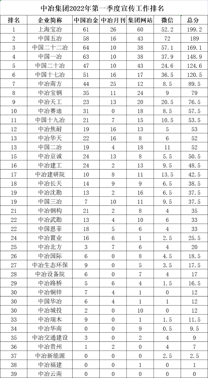中冶集團(tuán)2022年第一季度宣傳工作排名